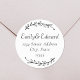 Custom-designed circular wedding return address labels featuring elegant hand-drawn laurel wreath. Personalize with couple/bride and groom's names and address. Perfect for adding a touch of style to wedding envelopes, gifts, favors, new home announcements, and more!