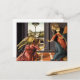 Botticelli Annunciation postcard. Tempera painting on panel from 1490. Sandro Botticelli was one of the great religious painters of the early renaissance. Annunciation is one of his most moving paintings and features the angel Gabriel announcing the birth of Christ to the Virgin Mary. The angel has golden wings and wears a soft red cloak with gold sleeves and holds a long stem of lilies. A pretty gift for fans of Botticelli, Early Renaissance art, and Christian paintings.