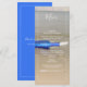 This design features a bottle laying on the beach. The beautiful blue bottle color contrasts against the golden sand creating a perfect match. The white fine lined border perfectly frames the washed up blue bottle on the sand and matches the modern white colored typography. Romantic beach design with a blend of simplicity and elegance. This design is ideal for a beach destination or blue themed wedding. The perfect summer blue beach wedding menu card design. Matching wedding invitations and other stationery items are also available.