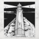 A black and white illustration of the lighthouse at the end of the boulder bank in Nelson, New Zealand. This lighthouse is at the cut near and has haulashore island in the background.
