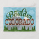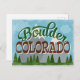 Boulder Colorado neo vintage travel poster wall art in cartoon retro style. It features snowy mountains and forest below with fun and happy retro text.