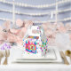 A vibrant and colorful inflatable castle, perfect for a fun-filled birthday party! Predominantly in shades of pink and blue, the castle features charming turrets with flags, battlement-adorned walls, and a bright yellow entrance. A protective net encloses the play area. Set on a flat surface, this whimsical castle brings energy and joy to any celebration.