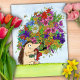 A hedgehog holding a bunch of flowers.