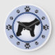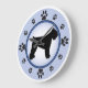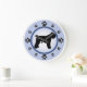 Bouvier des Flandres owners and dog lovers will enjoy this fun modern design featuring a bouvier silhouette and paw prints representing the numbers on the clock face, with a background of blue and a darker blue ring.