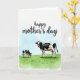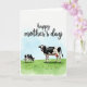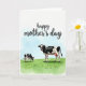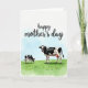 This card shows a soft pastoral scene centered on two black-and-white cows in a grassy field, sharing a calm, caring moment ❤️. An adult cow stands to the right with a steady, watchful gaze, while a smaller calf to the left lowers its head to graze, suggesting quiet closeness through their relaxed body language. The background uses gentle washes of green below and pale blue above, fading toward white to keep the scene airy and open. At the top, the words “happy mother’s day” sit in a flowing, cursive-style lettering, spaced to float above the animals without crowding them. The text appears in a dark tone that contrasts clearly against the light sky area, drawing the eye upward before returning to the pair below. Fine details show in the coat markings and soft shading along their bodies, and a subtle pink tone highlights the udder without overpowering the rest of the palette 🌼. The adult’s stance feels protective, with the calf positioned nearby as if lingering within a safe, familiar radius. The horizon line stays low, with broad green grass beneath the cows and a pale blue-to-white sky behind them.
