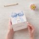 A beige, cream colored background, decorated with a large blue bow. Personalize and add name, party details, RSVP date, return address and name.