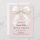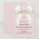 Celebrate her First Holy Communion with this elegant dusty blush pink invitation, featuring a luxurious ivory bow adorned with delicate pearl details and a subtle gold cross.