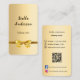 A faux gold looking background. Decorated with a golden bow. Personalize and add your name, title and contact information. Add your website url/link to the Qr code. With Facebook and Instagram icons. Black text.