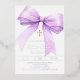 A white background, decorated with a lavender colored large bow and a golden cross. Personalize and add a name and details details. Real silver foil text.