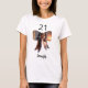 A white, light colored t-shirt Decorated with a bow shaped photo frame. Personalize and add a name and age. Black handwritten style script.