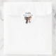 The sticker is made on wonderful paper and had no problem sticking to the bag that I purchased to put it on. I wanted to find a design that would be cute for the bride and groom and this one fit the bill as it has cute "bees" buzzing around and the wedding was taking place in a town called "Bee Cave". The packaging was great and protected the stickers. The website is easy to navigate and there are so many color choices. I had no problem finding a color that the bride was using on everything else selected. The design was adorable and there were many to choose from. You can make the figure as larger or smaller and you can place the photo and writting whereever you want to in the sticker. The printing is fabulous..better than expected.
