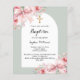 A white arch frame and sage green background. Decorated with pink flowers and pink bows. A golden cross. Personalize and add a name and details.