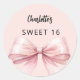 A blush pink colored background. Decorated with a large bow. Personalize and add a name. Black handwritten style script.