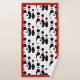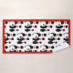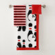 Bowling ball and pins black and red stripes custom bathroom towel. The bath towel showcases a pattern of a minimalist icon of three black bowling pins with red stripes and a ball. Around it there is a red border. The hand towel includes a striped pattern in red, black and white and the washcloth is of solid red color.
