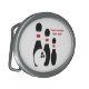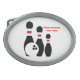 Bowling ball and pins black and red custom belt buckle featuring a minimalist icon of three black bowling pins with red stripes, a ball and your text on white background.