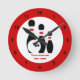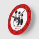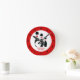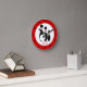 Bowling ball and pins round wall clock that features a minimalist icon of three black bowling pins with red stripes, a ball and your text on white background with red border. The perfect gift ideas for the fanatic bowler and the bowling lover.