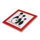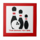 Bowling ball and pins custom ceramic tile featuring a minimalist icon of three black bowling pins with red stripes, a ball and your text on white background with red border. The perfect gift ideas for the fanatic bowler and the bowling lover.