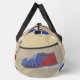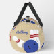 Tote your gear to the bowling alley in style with this personalized duffel bag. It's patterned with illustrations of bowling balls, bowling pins, and bowling shoes in red, white and blue against a tan background. On one side is a spot to add a name in blue script lettering.