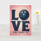 This greeting card features the big word “LOVE” centered on the front, with the “O” cleverly replaced by a dark, textured bowling ball with three finger holes, like a shared inside joke between two people 🥰. The letters and ball are rendered in deep, distressed indigo, giving them a slightly worn, cozy look against the soft background. Behind the word, blush pinks and warm creams spread outward in layered, watercolor-like rings, setting a gentle, romantic scene ❤️. Tiny speckles scattered across the design resemble paint splatters, adding extra texture and a casual, date-night-at-the-lanes feel. Beneath the main graphic, the phrase “Happy Valentine’s day” sits lower on the card in a flowing cursive style, also in a dark indigo tone. The strong, inky lettering paired with the tender pink-and-cream wash makes the message feel like a sweet nudge to go have fun together. The background radiates from the center in soft circular bands, with the indigo text and bowling ball standing out sharply in the middle.