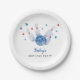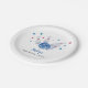Cute bowling theme boy's birthday party paper plate featuring watercolor illustration of a bowling ball hitting some pins with blue and red stars flying.