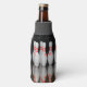 A bottle cooler featuring images of bowling pins.