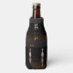 Bowling bottle cooler featuring photos of bowling pins, one is pair in split mode and the other is two pins about to be knocked down by a ball for a spare.