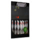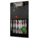 A clipboard featuring two photos of a green ball about to hit bowling pins and hitting bowling pins.