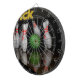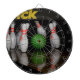 A dartboard that features a photo of bowling pins and a green bowling ball.