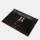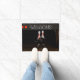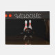 A doormat featuring a photo of two bowling pins about to be knocked down by a bowling ball.