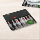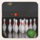 A drink coaster featuring a photo of a green bowling ball about to crash into a rack of bowling pins.