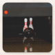 A drink coaster feature an image of two bowling pins about to be knocked down by a bowling ball for a spare.