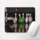 A mouse pad featuring a photo of a bowling ball crashing into bowling pins.