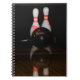 A notebook featuring a photo of two bowling pins about to be knocked down by a bowling ball.