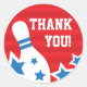 Bowling party thank you stickers featuring a white bowling pin with blue stars on a red, striped background, and customizable text "Thank you". Note, if you change the text make sure the new text is inside the safe zone. Fun design for boys and girls bowling parties.