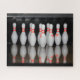 A jigsaw puzzle featuring a photo of a rack of bowling pins and their reflection.