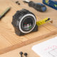 A tape measure featuring a photo of a bowling ball about to hit a rack of bowling pins.