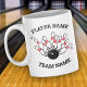 Our easily customizable bowling team logo lets you make truly personalized coffee mugs for each player. Add a player name, a team name, pick your color and size and you're ready to go.