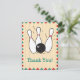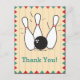 This fun design features a bowling ball striking a few pins. There is a fun bunting border in red and teal, as well as a wood background. Personalize the front and back with your own text. These postcards are great for saying thank you after a bowling party. They are especially fun for a kids birthday party.