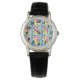 This women's watch has a mid-century modern design of rounded rectangles, some of which are attached and some of which have starbursts, in retro colors of red, gold, green, and turquoise. If you like the design but prefer different colors, message me.