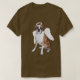 My 11 yo wore adult XL (5’7” 165#). The 8yo is small framed. She wore adult small and tied it in the back. Grandma wore adult large with long sleeve shirt underneath. Tall girl adult medium. Dark haired male adult large. Good quality dark Heather gray, Gildan brand shirt. -it was next up from basic choice and cost about $20 per shirt. Not too thick or thin. Washed and dried well, no major shrinkage. Not see-through. Can wear a bra under it fine. Screen print is just as shown and well done, front and back.