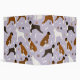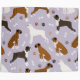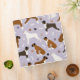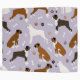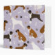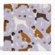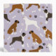 Cute Boxer dogs sits and stands with brindle, white and fawn coats with scattered dog bones and pawprints pattern.