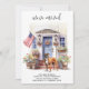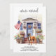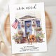 Announce your move to family and friends with our patriotic moving announcement featuring a beautiful watercolor painting of a Boxer dog, modern house with a blue door and the American flag proudly displayed on the front porch. This announcement is perfect for dog lovers and anyone looking to announce their new address. With its red, white, and blue color scheme, this announcement is a great way to show your love for the USA while sharing your exciting news. Let everyone know that "We've moved!" and invite them to come visit and meet your best friend in your new home. COPYRIGHT © 2023 Judy Burrows, Black Dog Art - All Rights Reserved. Boxer Dog Patriotic Personalized Pet Moving Announcement