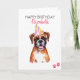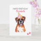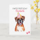 Happy Birthday with a personalized name. A cute Boxer puppy dog illustration with a birthday hat and balloons. Add your own message for a personal unique card. Art made with watercolors.