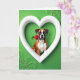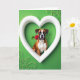 This card features a fawn-and-white Boxer dog centered inside a large glossy white heart, looking straight out with bright eyes and a slightly open mouth that feels like a friendly invitation 💚. A single red rose rests gently between its teeth, with a green stem and leaf standing out against the dog’s warm fur. The dog’s head tilts just a little, giving the scene a flirty, affectionate energy, like it’s offering the flower to someone special. Behind the heart frame, the background is deep green with lighter green swirls that curl softly like decorative flourishes ☘️. Soft, bright lighting brings out the texture of the coat and the layered rose petals, while faint shadows add depth along the heart’s curved edges. The greeting text sits near the top in white lettering so it reads clearly against the green backdrop. The heart’s smooth white border surrounds the dog and rose, with the pale green swirls scattered around the edges of the background.