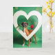 This card shows a fawn boxer posed like a studio portrait, centered inside a large cream-colored heart frame that reads like a sweet hug from a close friend 💚. The dog’s dark, attentive eyes meet yours, and the white blaze on its chest catches the light like a little spotlight. A red rose with green leaves rests gently between its jowls, and a couple of front teeth peek out in a grin that feels like it’s meant for someone special ☘️. Behind the heart, the background is spring green, dotted with lighter green circles and fine line accents that add a festive, airy look. The lighting is soft and bright, showing the smooth sheen of the coat and the satiny texture of the rose petals. Text sits above the heart in a light cream tone, with a smaller line placed below in matching color so it feels neatly balanced. The cream heart frame has rounded edges and sits crisply against the green backdrop, with the subtle circular motifs spaced around it.