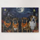 Unleash the spooky spirit with this eerie Halloween design featuring a pack of dogs under a dark, moonlit sky, surrounded by flying bats and glowing pumpkins. Perfect for those who love a touch of frightful fun with their furry friends!