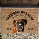 Boxer Personalized Dog lover welcome doormat. This welcome mat can be personalized with your dog’s name, the slogan can also be changed or you could use a picture of your own dog (make sure it's transparent). Text reads: Theodore lives here…. All treats welcome