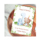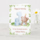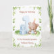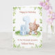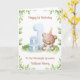 This watercolour 1st birthday card is suitable for a grandson or son. The design includes a greenery border, the birthday number 1 in blue, and a brown teddy bear with party hat, balloon and gifts.