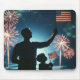 Silhouetted figures of an adult and young boy hold American flags, gazing at a sky lit up with vibrant fireworks