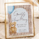 Make your baby shower extra fun with this Guess How Many Bears Are in the Jar table sign from the We Can Bearly Wait Boy Baby Shower Collection by Porch and Gable Design. The design features a soft light blue arch set against a charming watercolor brown gingham plaid, accented by an adorable teddy bear holding a blue balloon. The sign reads “Guess How Many Bears Are in the Jar. The Closest Guess Wins,” but all text is fully customizable to suit your party game.